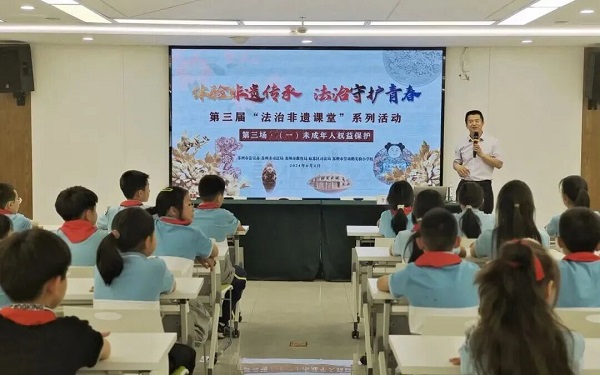全面落实《青少年法治教育大纲》,将法治教育贯穿学校教育各阶段。全市有1231名政法系统干警在879个中小学校区任职,构建起“公安干警全覆盖,法官、检察官、司法干警按需配备”的整体格局;每年举办“青少年法治宣传教育周”“学宪法讲宪法”等主题活动,在40余所学校开设“法治非遗课堂”,惠及学生1万余人次。