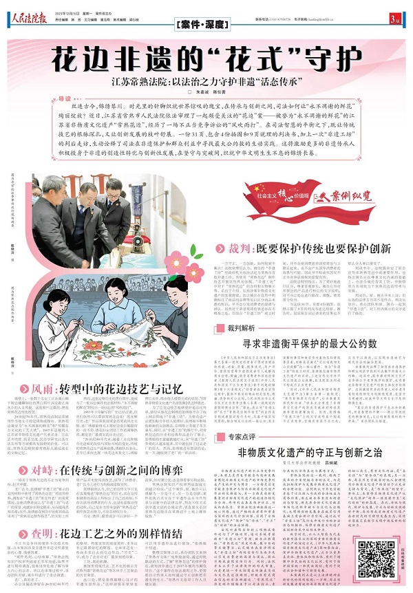 常熟法院的这一裁判,超越了简单的个案侵权与否的认定,而是承担起保护与发展非物质文化遗产的治理功能。法院既认可历史贡献者基于过往投入形成的合法权益与商誉积累,要求被告尊重原告的劳动与智慧,避免原告的文化贡献在市场化进程中被不当淡化与边缘化;也明确创新发展者在诚实信用基础上有合理行为空间,通过认可“非遗工坊”及衍生开发行为的合法性与积极性,保障非物质文化遗产在创新传承中延续生命力。
