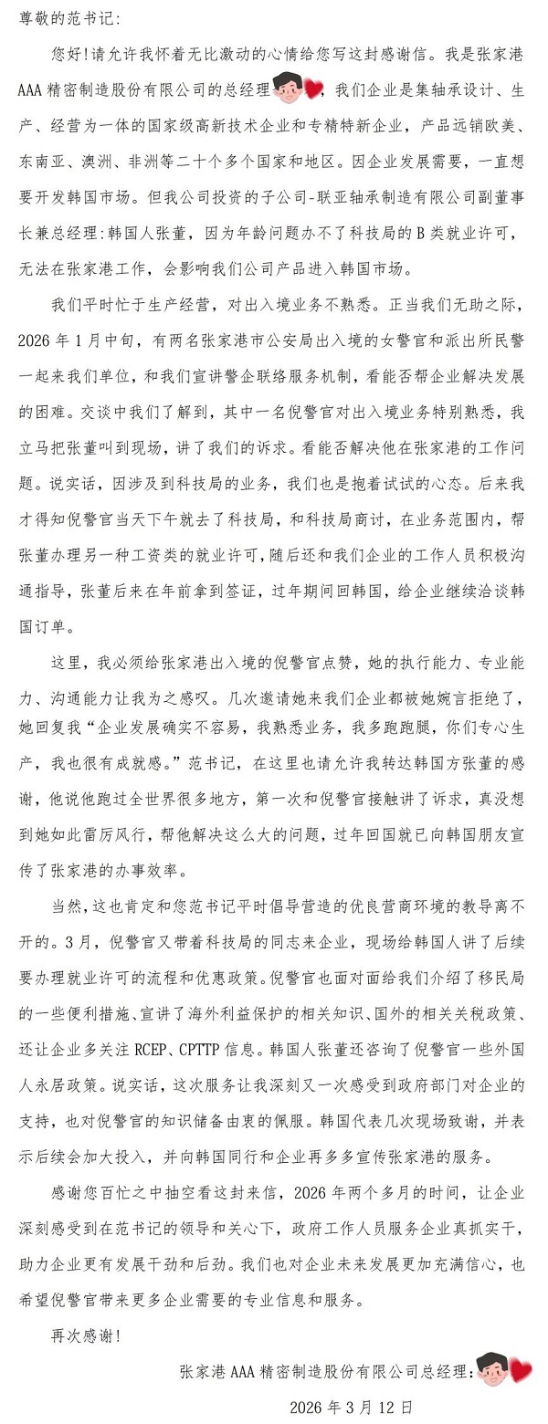 近日,张家港市公安局收到一封苏州市委转来的感谢信,来信人是张家港AAA精密制造股份有限公司负责人李先生,对张家港市公安局出入境管理大队国际合作中队中队长倪红主动作为、服务企业的暖心之举表达了诚挚感谢。