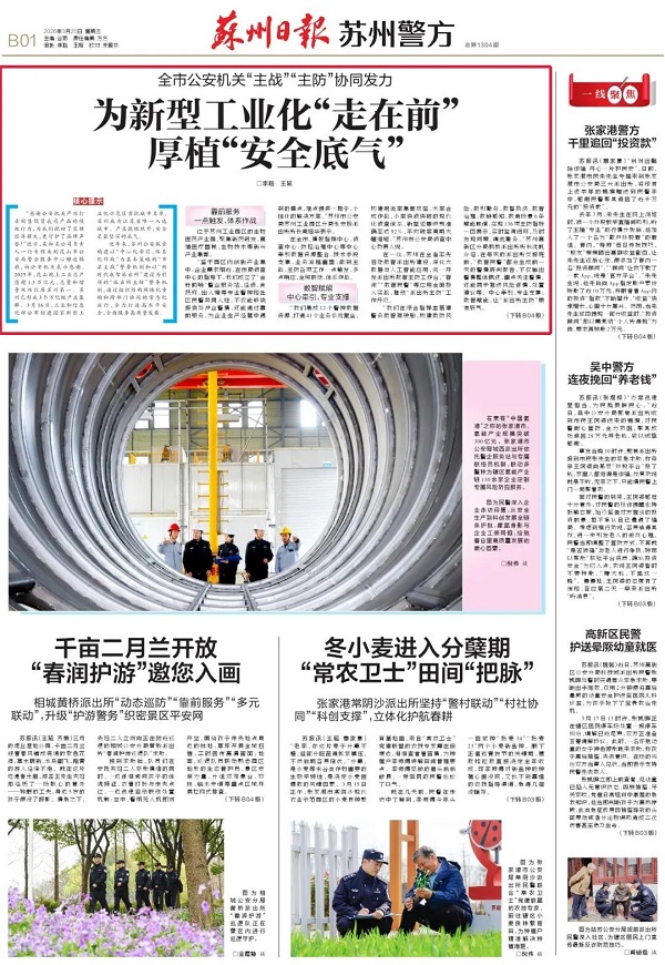 苏州公安机关进一步建立健全市、县、派出所三级警企联络服务机制,为规模以上企业配设警务联络员,创新推出加强警企沟通联络、优化涉企服务保障、规范涉企执法活动、精细涉企安全守护4个方面18项举措,形成“一企一警、一园一站、多警联动、全周期服务”的工作格局。