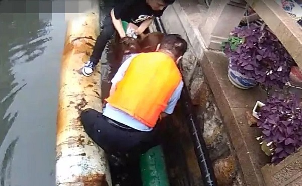 近日,一女子出门急匆匆地寻找宠物猫,结果因未注意观察路况而掉入河中,陷入了绝境。就在这千钧一发之际,警务人员周冰跳入河中将她救了上来。