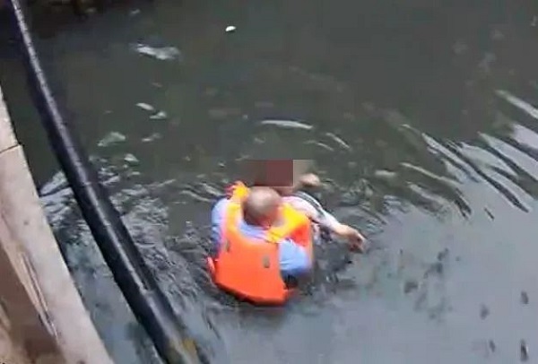 眼看女子快要完全沉入水中,警务人员周冰立即穿上救生衣,借助桥边的蒸汽管道下到河中,随后来到女子身边。周冰一只手托举起女子头部,让她浮出水面呼吸;另一只手则用胳膊拽住女子腹部,让她直立,同时用力挤压,使女子吐出呛进去的水。