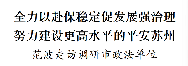12月24日,市委书记范波走访调研市政法单位,强调要深入学习贯彻习近平总书记关于政法工作的重要论述,认真贯彻落实党的二十届四中全会精神和习近平总书记对江苏、苏州工作重要讲话重要指示精神,坚定扛起职责使命,全力以赴保稳定、促发展、强治理,努力建设更高水平的平安苏州。市委副书记、政法委书记黄爱军参加调研。